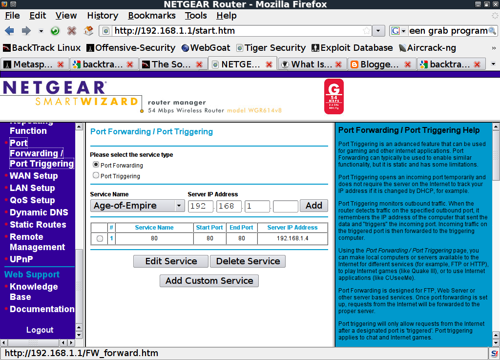 2. Next, we need to set up the router for port forwarding so people from the outside Internet can connect to the fake web server. In order to do this with my particular router, you must first navigate to http://192.168.1.1 and login to the control panel. From there, scroll down to Port Forwarding/Port Triggering on the left-hand side. From there, add a custom service that forwards traffic through Port 80 on TCP/UDP to your local IP address (in my case, 192.168.1.4)